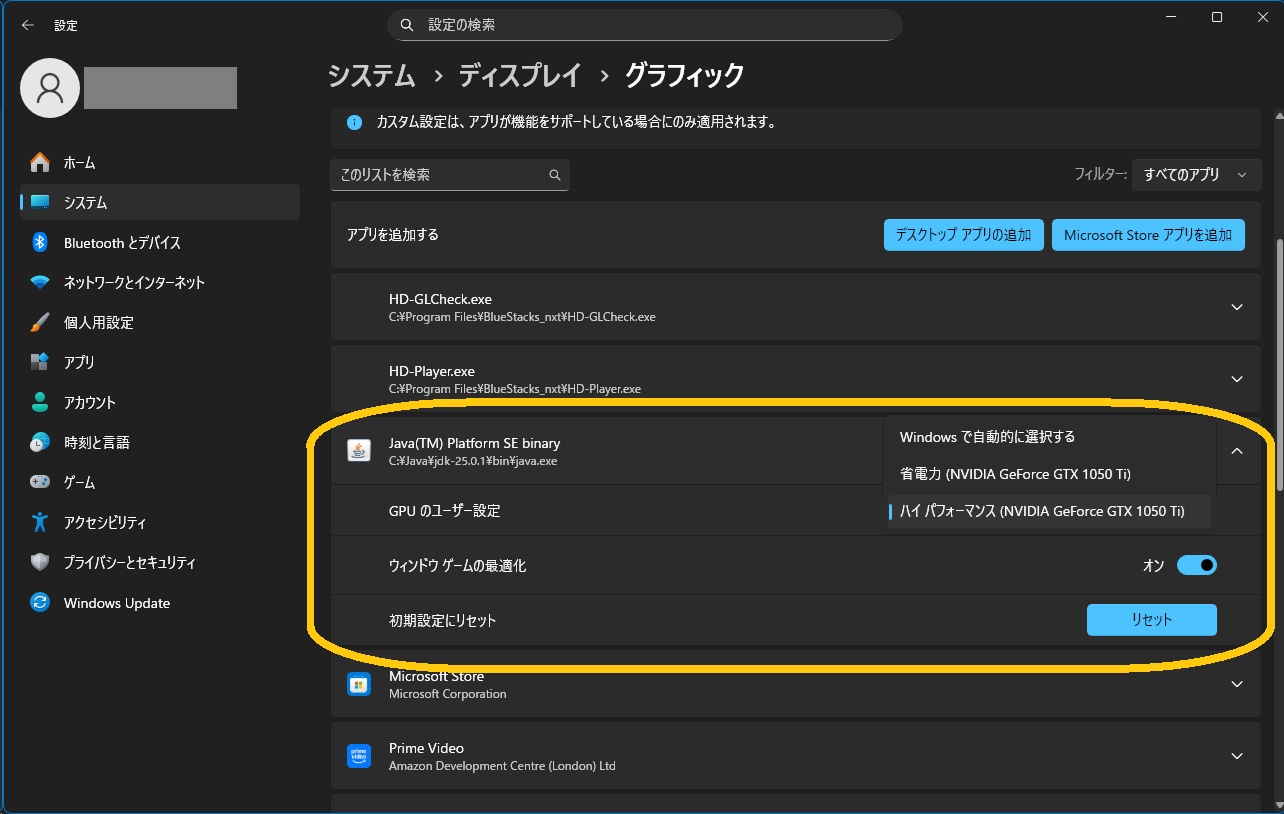 現在のWindows 10/11では、設定アプリの『システム > ディスプレイ > グラフィック』から、アプリごとに使用するGPU(高パフォーマンス)を選択できます。